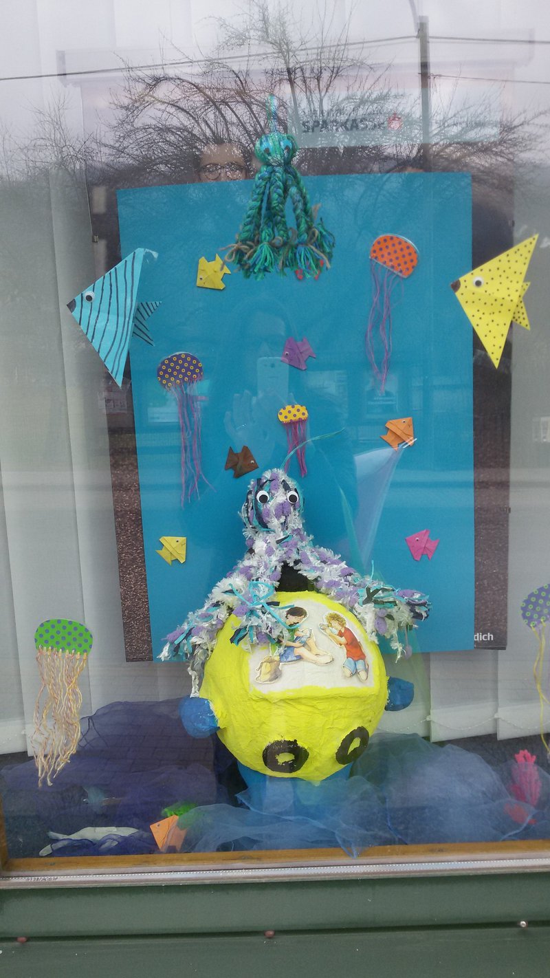 Ich besuche jeden Montag die Nami als Jahresprojekt. Ich machte den Vorschlag eines Lese-Schaufensters und die Kinder waren gleich dabei. Ich las ihnen zuerst das Buch vor, immer wenn es spannend wurde, hörte ich auf. Ich nahm das Buch mit nach Hause und eine Woche später wurde ich schon sehnsüchtig erwartet. Dann gings ans Ideen sammeln fürs Schaufenster. Es wurde gefaltet, gezeichnet, geflochten, geklebt und das U-Boot gebastelt. Und das Ergebnis kann sich sehen lassen. Kinder sind sehr kreativ.- Projektleitung: