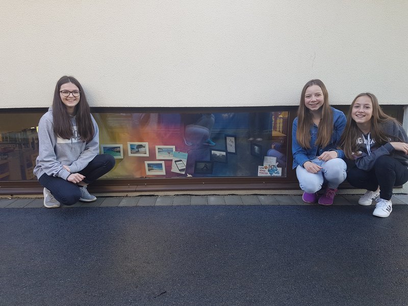 Wir haben das Buch "Status Karibik" geradezu verschlungen. Nach unserer Buchpräsentation im Deutsch-Unterricht haben wir in BE und Werken unser Schaufenster gestaltet. Am Farbverlauf des Hintergrundes sollen Passantinnen die über Facebook vorgetäuschte Stimmung von Sonja (Hautfigur) erkennen. Den Stoff haben wir mit Graffitti-Stofffarben besprüht. Die hellen Bilderrahmen mit den Urlaubsschnappschüssen stehen den schwarzen Rahmen mit den trüben, düsteren Bildern gegenüber. Sie sollen Sonjas reale, depressive Gefühlswelt widerspiegeln.- Projektleitung: