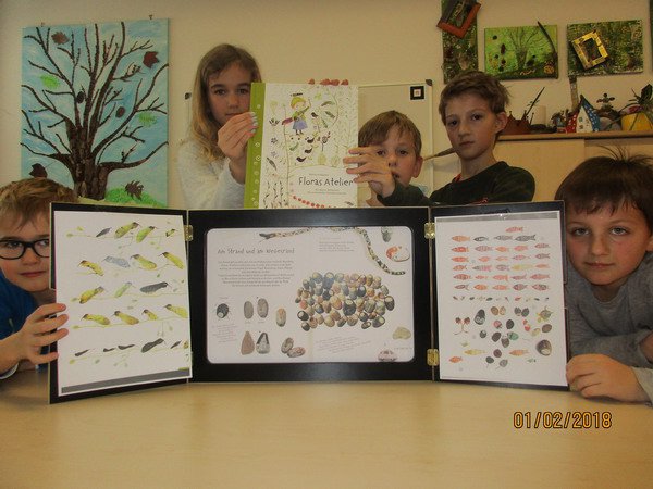 Wir haben uns für das Buch „Floras Atelier“ (die kleine Werkstatt für zauberhafte Naturkunstwerke) von Kristina Digman gemeinsam entschieden, da wir gern und oft mit Naturmaterialen basteln. Es wurde von den Kindern mit Begeisterung aufgenommen. Nach dem Sortieren, der im Gruppenraum vorhandenen Naturmaterialien, wurde sofort mit der Umsetzung der Bastelvorschläge begonnen. Bereits nach zwei Wochen konnte das Gesamtbild gestaltet werden. Wir sind sehr stolz auf das Endprodukt und hatten großen Spaß am Gestalten.- Projektleitung: