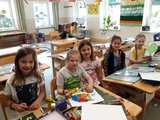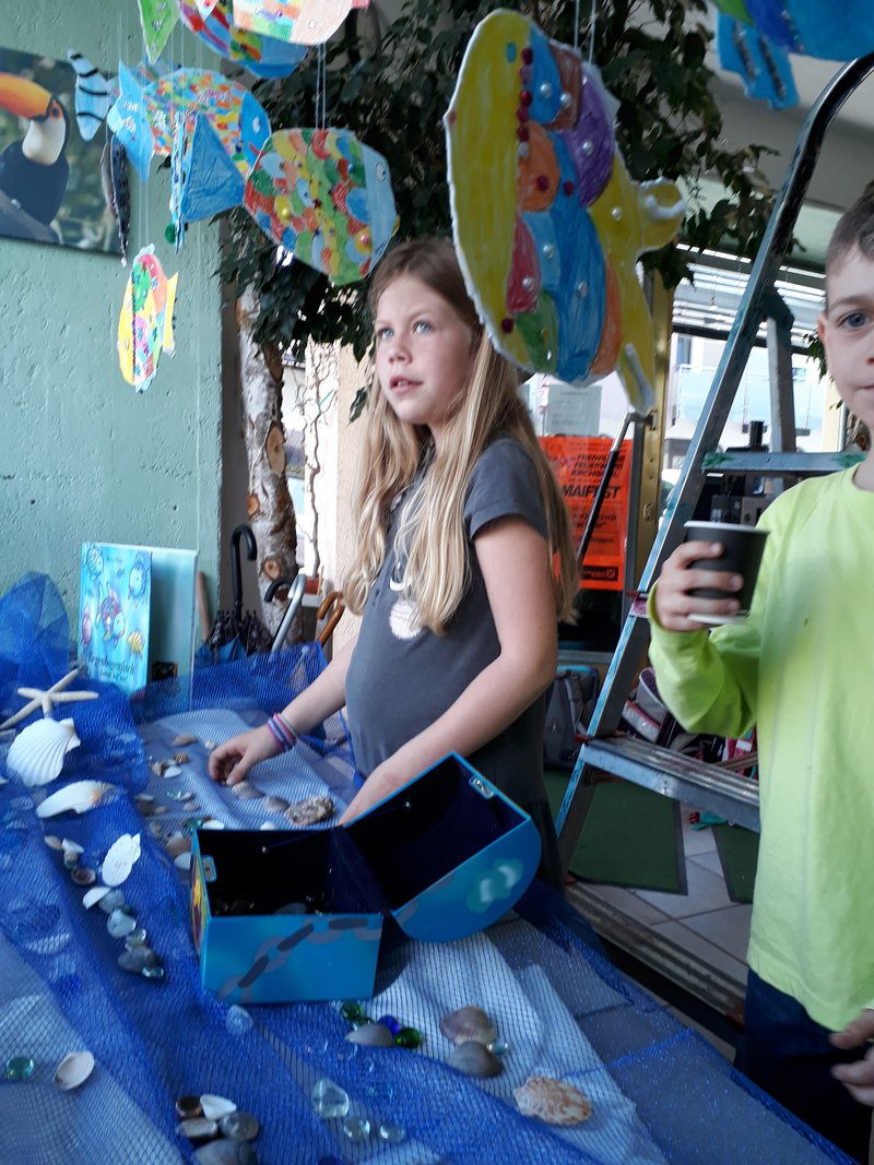 In der Klasse haben wir die Geschichte des Regenbogenfisches gelesen, Fische gebastelt und diese im Schaufenster mit Meereshintergrund und Muscheln ausgestellt.- Projektleitung: